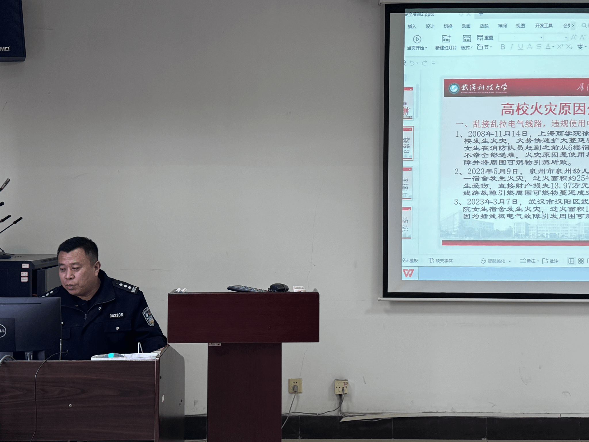 武科大网讯(通讯员易阳帆)为普及消防安全知识,公司于11月23日下午在41401室举办“消防安全月”系列活动之消防安全知识讲座。本次讲座特别邀请保卫处段晓栋老师作报告,公司党委副书记(主持工作)杨彦、行政副经理赵厚成出席活动,公司各办公室、各系教师代表和50余名员工代表参加讲座。