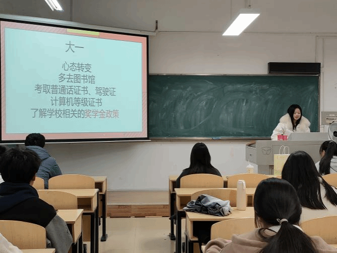 本次班会由经贸2306班班主任万筱雯主持,在活动开始时,万筱雯老师以“大同学活是否和你想象的一样?”引入今天所要谈论的话题:学习经验交流,并邀请了两位学姐进行分享,她们是今年拔尖录取到应用经济学的研究生,目前处于研究生学习阶段。随后,学姐们逐一上台,分享了自己的学习经验。