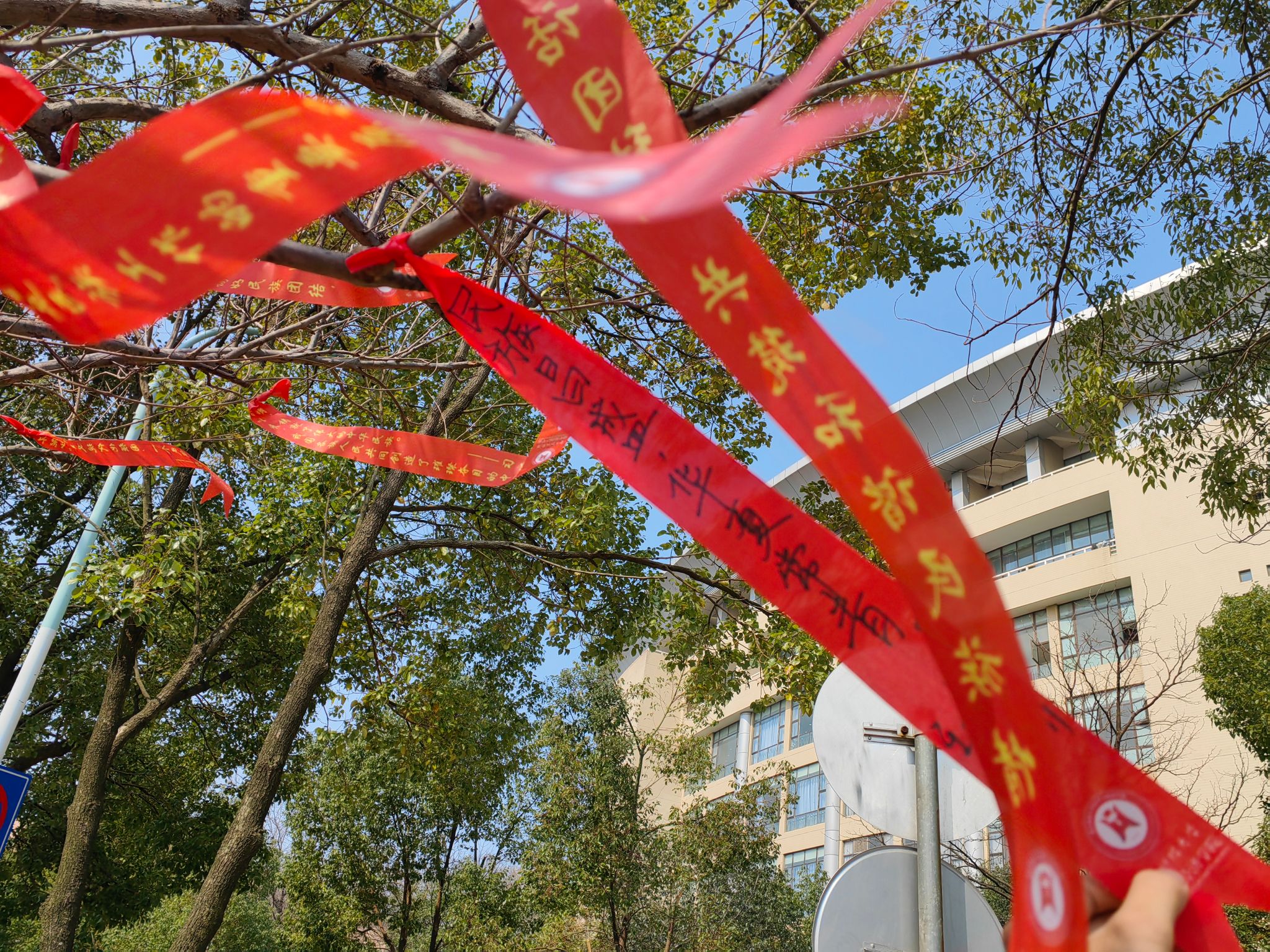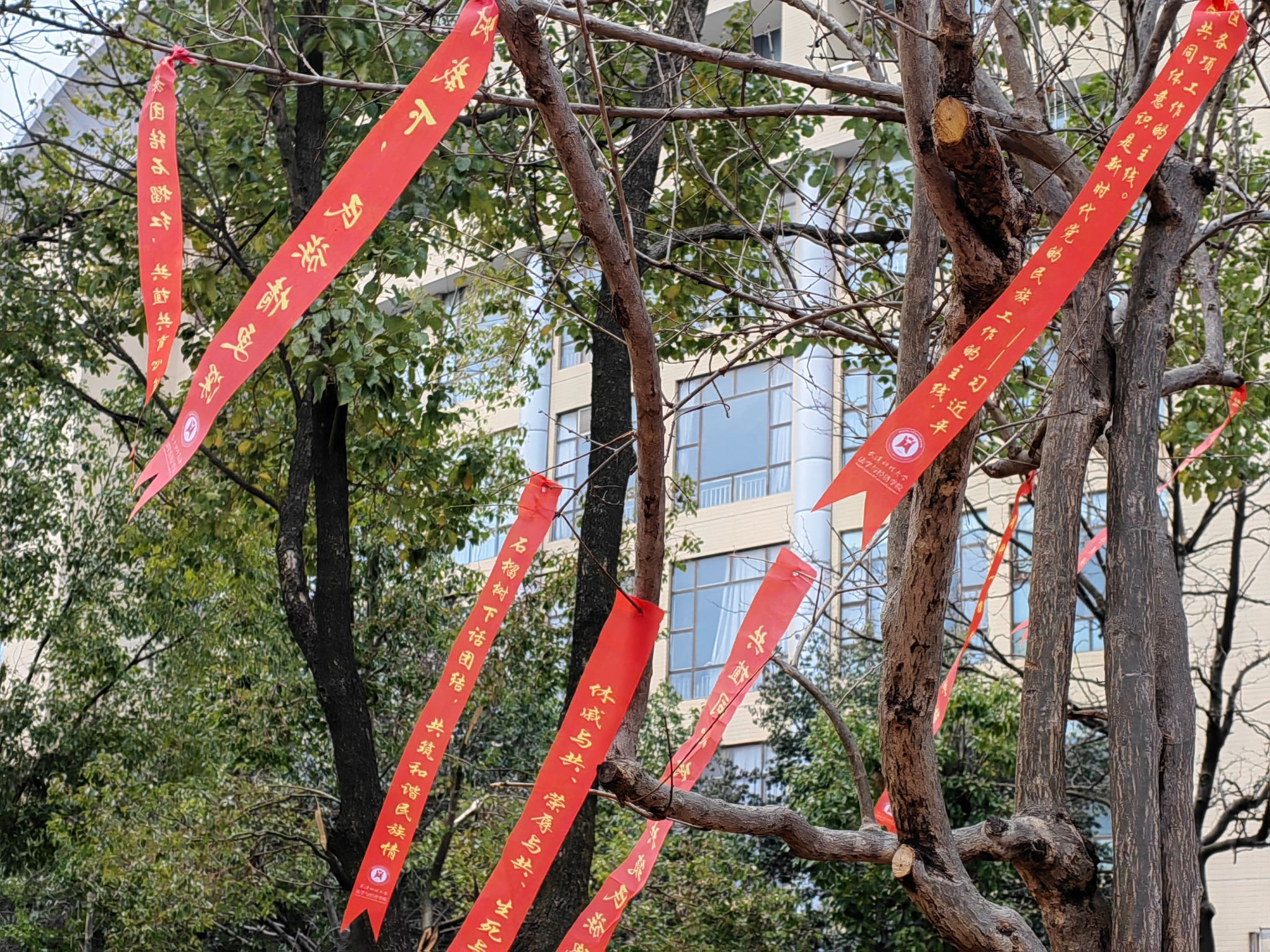 “民族团结是我国各民族人民的生命线,中华民族共同体意识是民族团结之本”“各民族要相互了解、相互尊重、相互包容、相互欣赏、相互学习、相互帮助,像石榴籽那样紧紧抱在一起”“石榴树栽下,民族情更深”……石榴树下,研究基地提前准备了红绸带与便利贴,师生们将习总书记关于加强和改进民族工作的重要思想以及自己对铸牢中华民族共同体意识的理解、对民族团结进步的美好祝愿写在绸带上,然后将祝福彩带悬挂到石榴树上,共同表达对铸牢中华民族共同体意识的信心决心,营造民族团结的良好氛围。