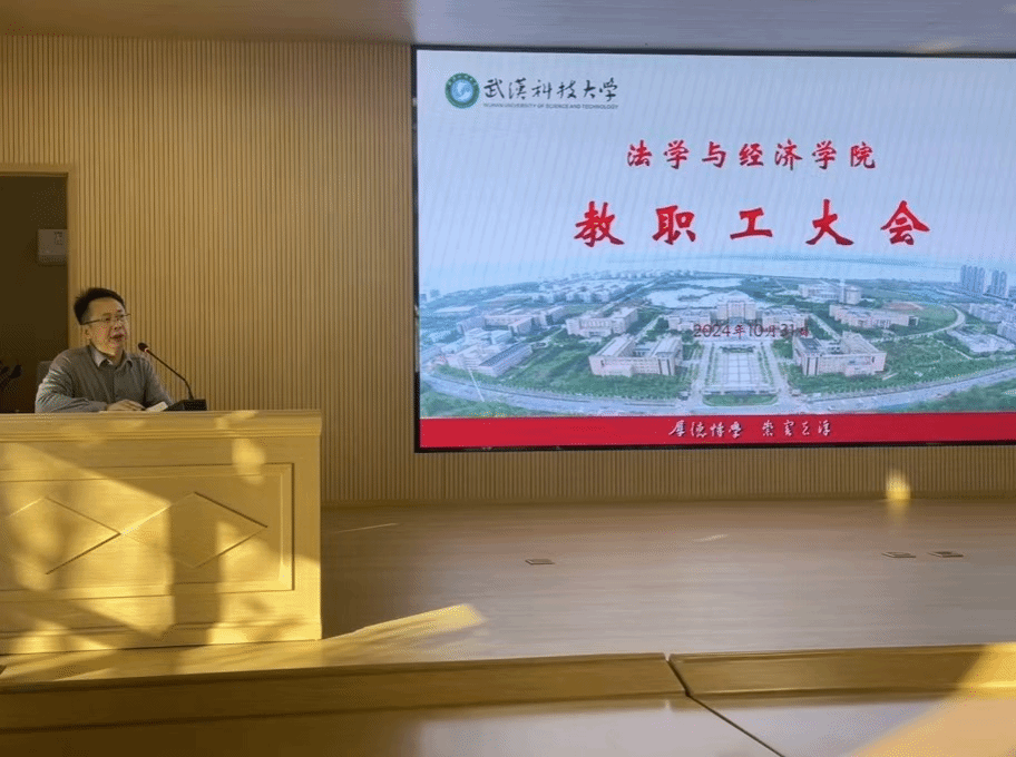 武科大网讯(通讯员 杜逸涵)10月31日下午,全院教职工大会在公司模拟法庭举行,公司领导班子成员及全体教职工参加会议,公司党委副书记彭晓峰主持会议。