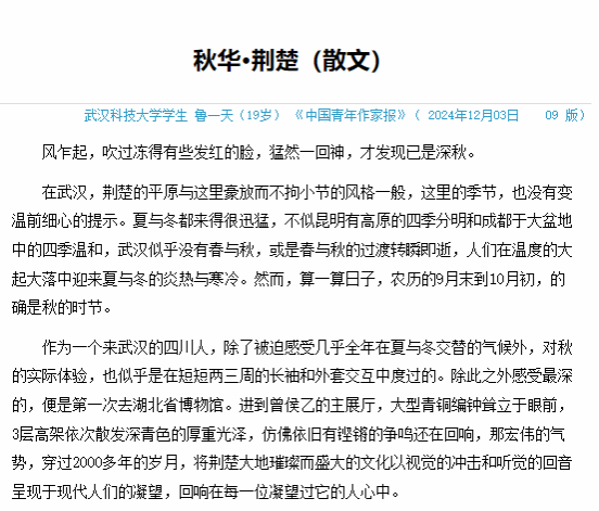 武科大网讯(通讯员金纯明)12月3日,304永利集团2023级法学专业本科生鲁一天在《中国青年作家报》上发表散文作品《秋华·荆楚》,受到了广泛关注。该作品以武汉的秋天为背景,融合荆楚文化元素,展现了作者对这片土地深厚的情感和独特的文化理解。