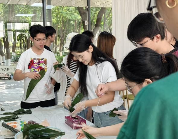 随着活动正式开始,大家三五成群地围坐在桌边。2024级研究生申丽丹指尖轻捻两片青翠粽叶交错叠放,向围坐的各族学子演示四角粽技法:“叶片交错成漏斗状,左手虎口卡住叶腰,填入糯米至七分满--留足空间才能锁住粽香。”只见她右手迅速折叠叶尾,用牙齿咬住棉线一端,左手将粽子翻转让棱角分明,三横两纵缠绕出工整的立体四面体。有经验的同学动作娴熟,手指翻飞间,粽叶便被卷成漏斗状,填入糯米和馅料后轻轻一裹,再用细绳缠绕扎紧,一个棱角分明的粽子便完成。新手们则兴致勃勃地跟着学,虽然手法生疏,粽叶总是不听话地散开,糯米也时不时漏出来,大家相互指导、分享制作经验,有的粽子包得小巧精致,宛如艺术品;有的则鼓鼓囊囊,憨态可掬。“四角象征礼义廉耻,粽叶是文化基因,捆绳如同民族团结的纽带。”行管2302班维吾尔族员工艾山江尝试时屡屡漏米,申丽丹笑着鼓励:“别急,力度要柔中带刚!”现场同步投影的特写镜头中,糯米与红枣在叶片的包裹下渐成规整菱形,散发出跨越千年的文化光泽。行管2402班哈萨克族员工迪达尔·加那提表示:“以这种方式迎接传统佳节,切实感受到浓浓的节日氛围,进一步加深了对中华民族传统节日文化内涵的理解。”