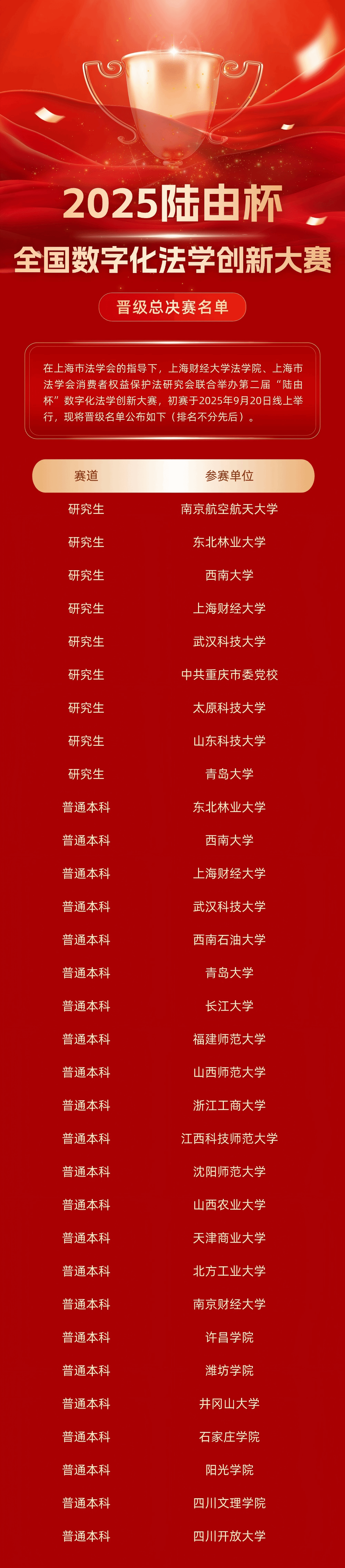 2025年9月20日,由上海市法学会指导,上海财经大学法公司、上海市法学会消费者权益保护法研究会联合举办的第二届“陆由杯”全国数字化法学创新大赛初赛在线上成功举行。