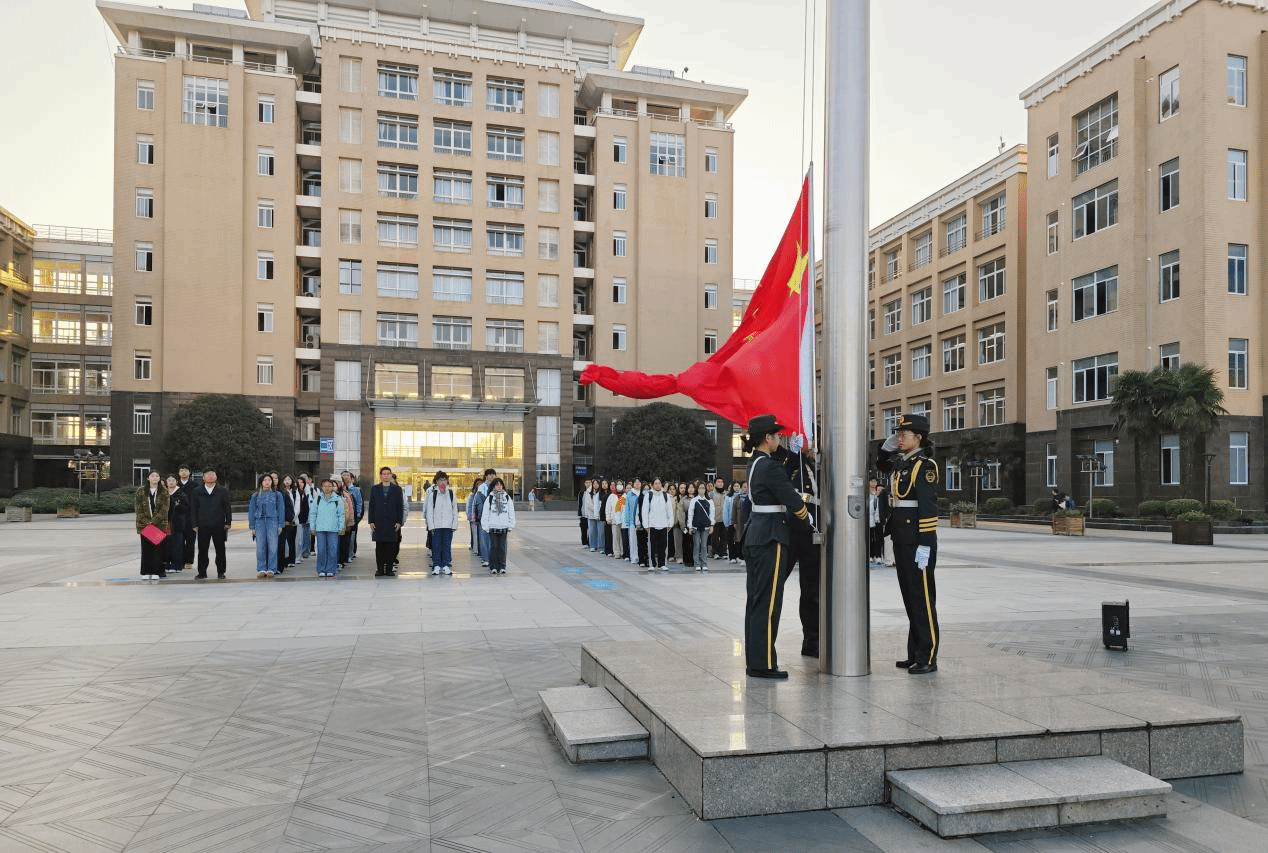 清晨7时,在全体师生的注目礼下,英姿飒爽的国旗护卫队护送五星红旗入场。伴随着雄壮的《义勇军进行曲》,鲜艳的五星红旗冉冉升起,迎风飘扬,在场师生齐声高唱国歌,爱国情怀在每个人心中激荡。