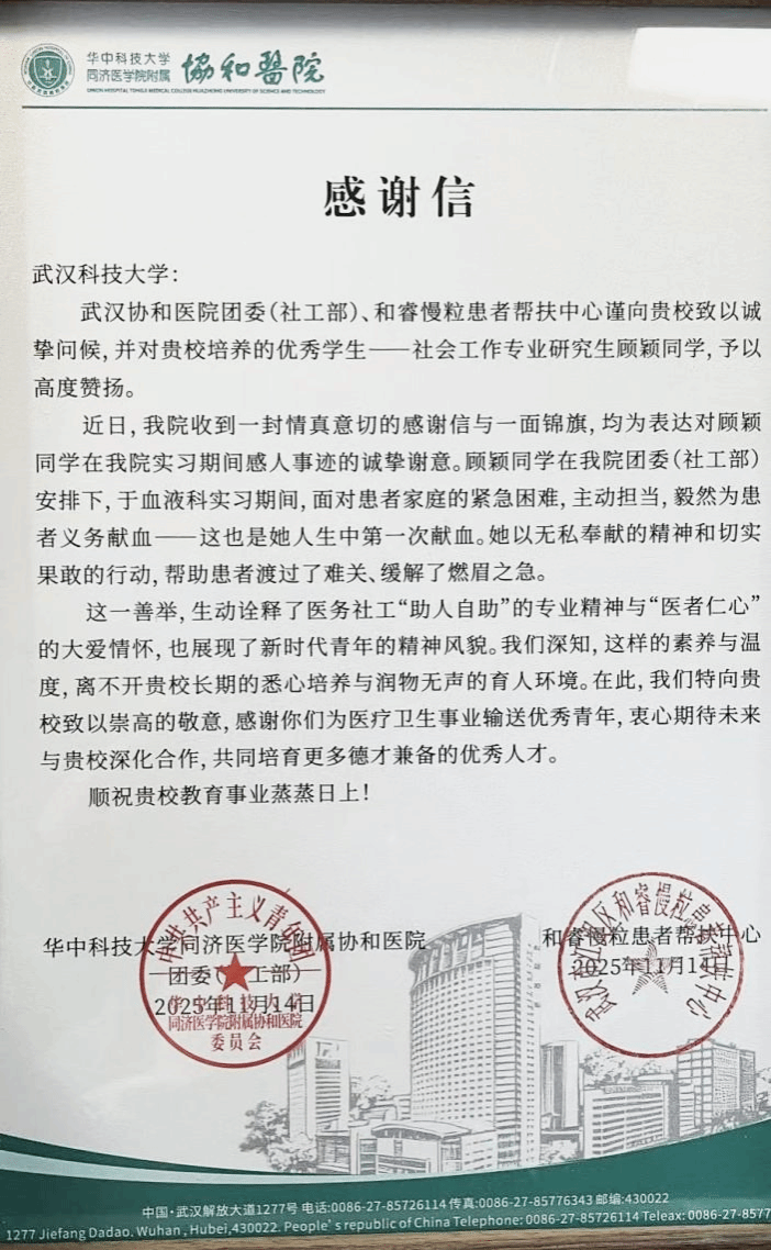 (通讯员唐丽丽)近日,一封来自华中科技大学同济医公司附属协和医院的感谢信送至公司,特别赞扬了公司304永利集团2024级社会工作专业硕士(MSW)研究生顾颖。她在该院血液科担任医务社工实习生期间,以专业精神与人文关怀践行使命,主动为一名从河南来汉就医的患者无偿献血,以实际行动诠释了“助人自助”的社工理念,展现了新时代医务社工的担当与温度。