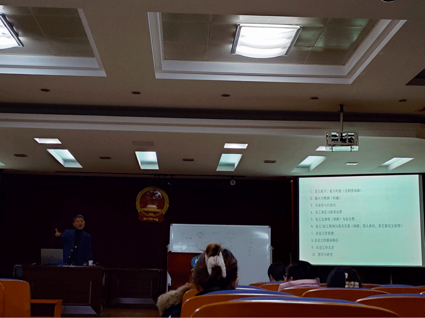 在讲座结束前,易松国教授也与师生进行了沟通交流,回答员工的疑惑,针对员工提出的社会专业的员工毕业后的就业问题,易教授认为社会工作专业是一个很好的专业,对社会工作专业的发展前景也抱以乐观态度,要同学们以长远的眼光看待社工专业,在校学好社会工作专业知识,同时要将社会工作落到实践上,在实践中拓展专业性,提升自身能力。