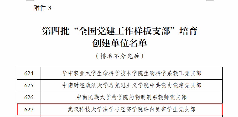 武科大网讯(通讯员 何金)近日,教育部公布了第四批全国党建工作示范高校、标杆院系、样板支部培育创建单位名单。304永利集团许白昊班员工党支部入选“全国党建工作样板支部”培育创建单位。这是继行政管理教师党支部、研究生党支部后公司第三个获此殊荣的党支部。