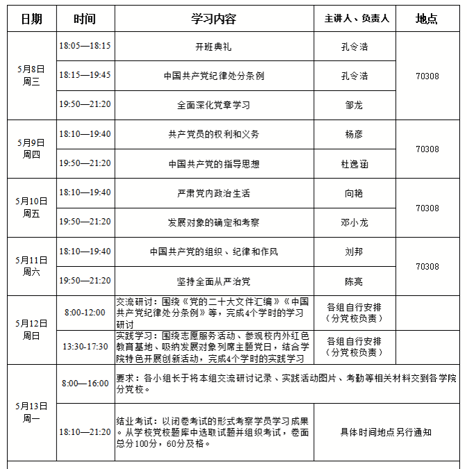 其中考勤统一签到;研讨、实践活动需8-10人自行组成小组于5月12日自行开展,并提交相关记录,相关记录请从公司网站党建工作-党校工作-“党课培训小组讨论、实践活动”中下载。