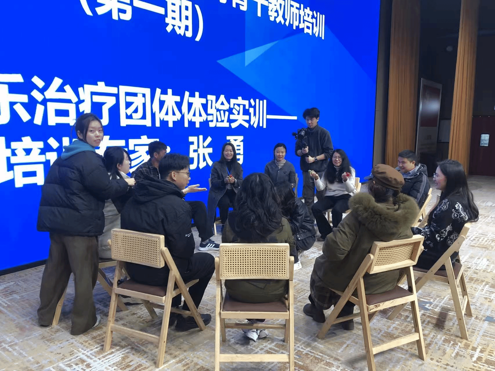 实训过程中,三位同学在导师张勇教授的指导下,圆满完成了担任主持音乐治疗师和辅助音乐治疗师的角色。在“即兴舞动治疗”活动中,郑炜慧指导10名学员中的每位成员即兴创作舞蹈动作,并让他们分别带领大家共同表演创作的动作,进而展示了不同学员的舞动风采。在“音乐沙蛋传递”活动中,周晓颖指导10名学员开展了在音乐中传递沙蛋和抽取字条回答问题活动。邓倩倩作为本次活动的辅助音乐治疗师,协助主持治疗师开展了各项活动。